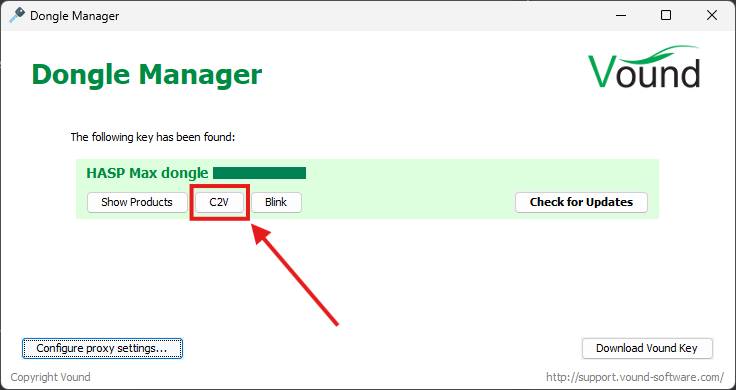 - If you have only one dongle plugged in, save the C2V file onto your computer when prompted. Then, send the C2V file to the Vound representative who requested it.