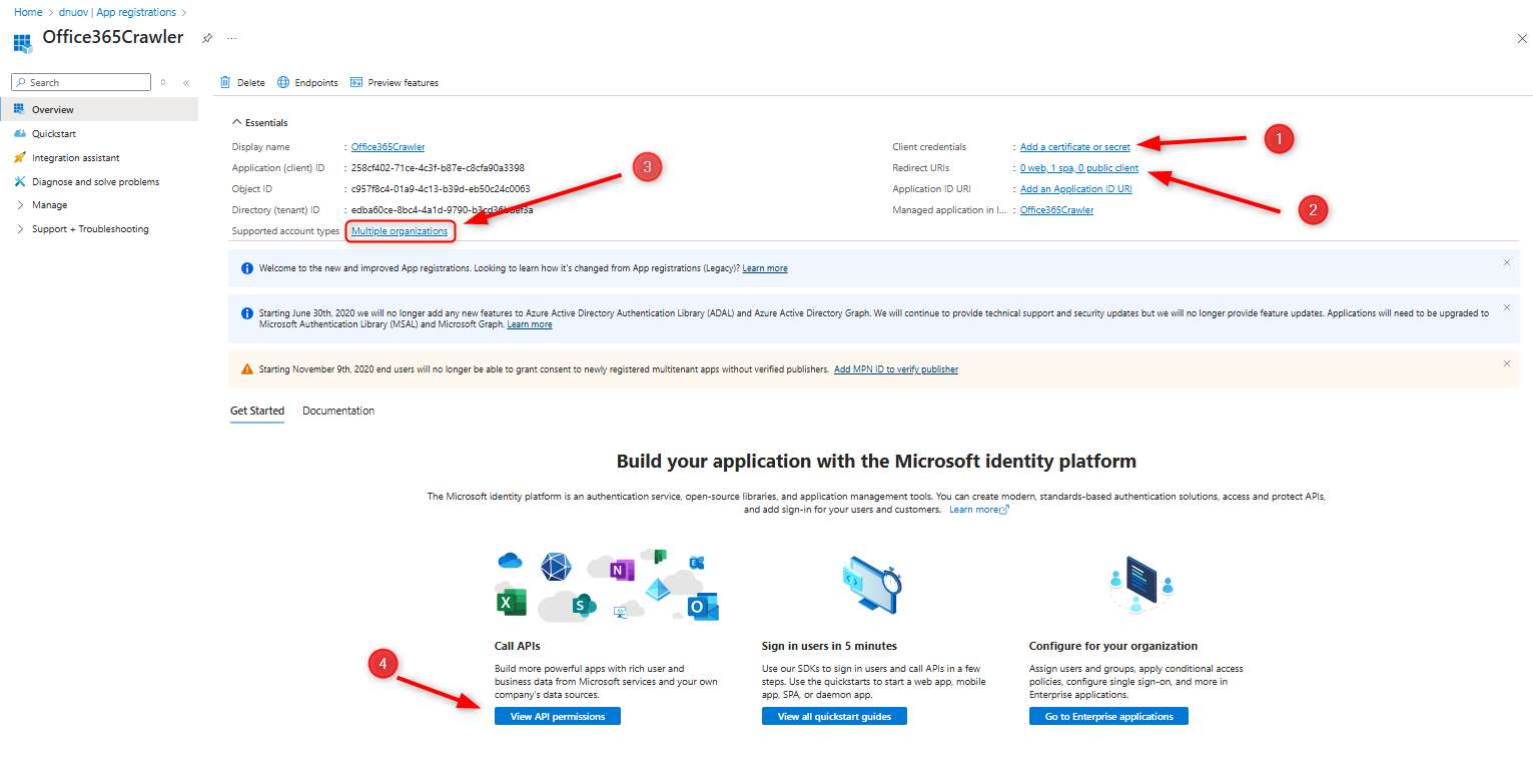 In the above screenshot (in "Step 5") choose the link marked with # 1, which points to "Credentials" page. It allows you to set up a client secret, and it is required to be configured only when you plan to have Intella collect the data via the application login method.