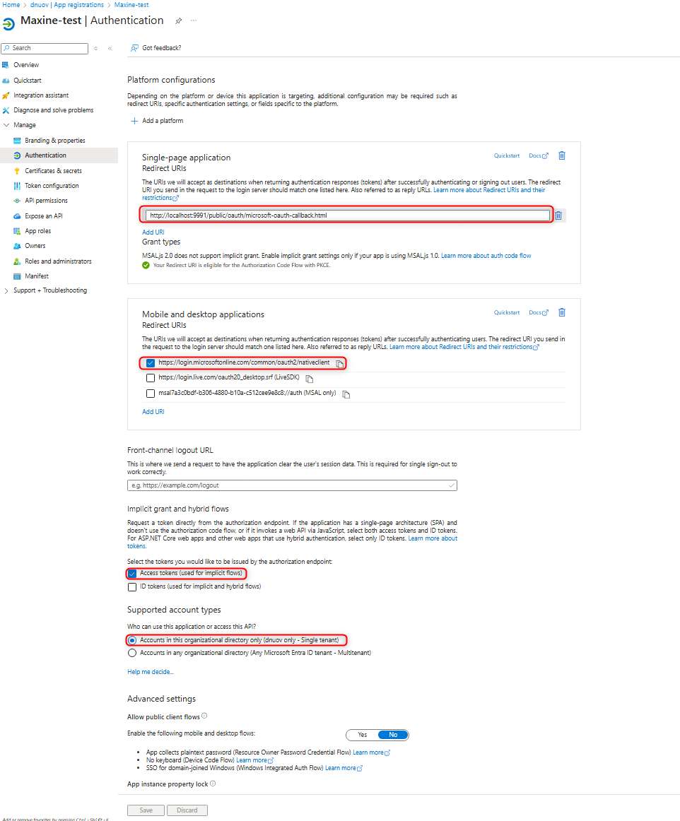 - For the Redirect URI, select "Single-page application (SPA)" and set its value to: http://localhost:38081/public/oauth/microsoft-oauth-callback.html