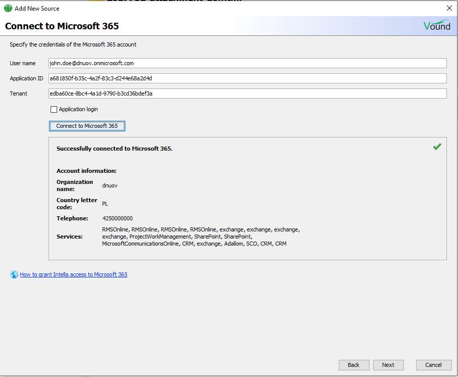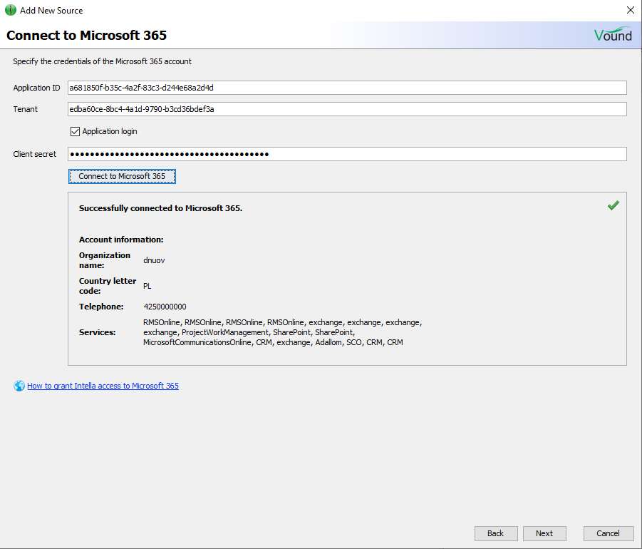 When ready, click the "Connect to Microsoft 365" button, then Intella will present you with basic account information.