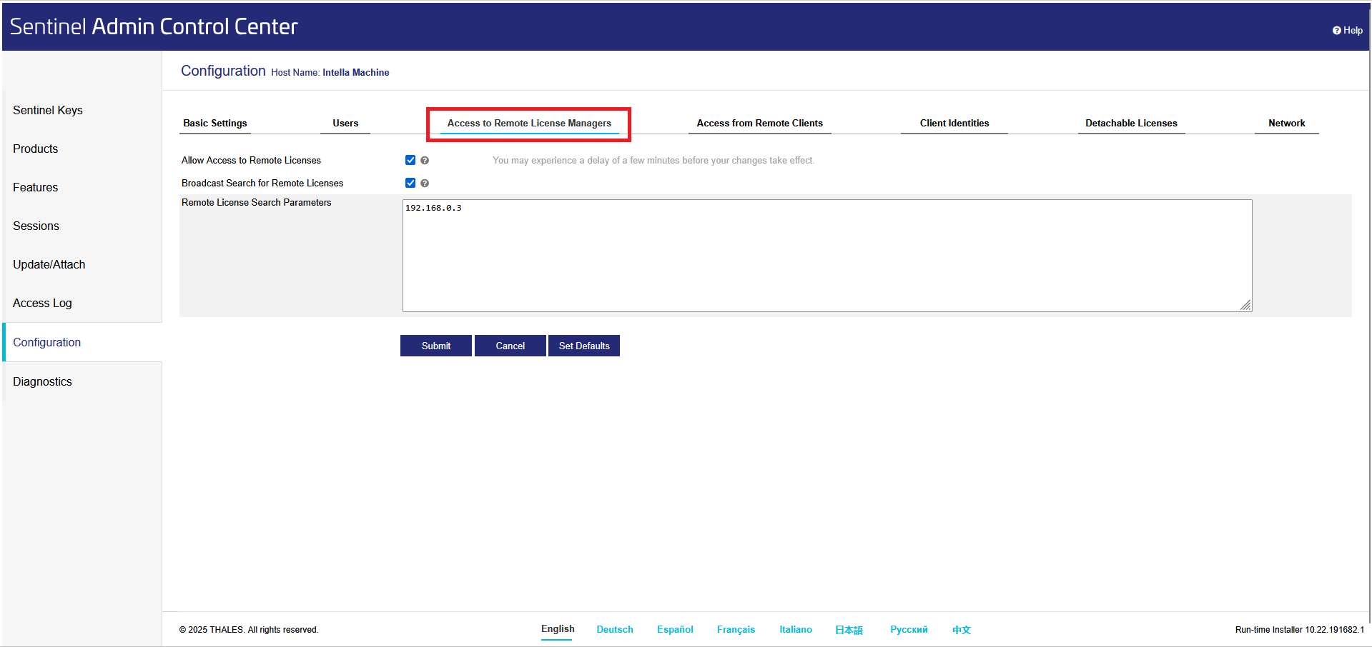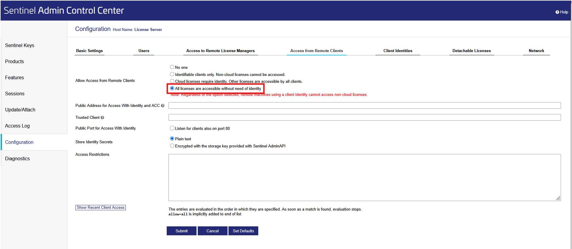 - Navigate to the "Access from Remote Clients" tab (http://localhost:1947/_int_/config_from.html). Make sure that the setting for 'Allow Access from Remote Clients' setting is set to "All licenses are accessible without need of identity". Click Submit if you have made changes.You can optionally apply "Access Restrictions", but it is recommended to do so only after you've confirmed the machines can communicate.