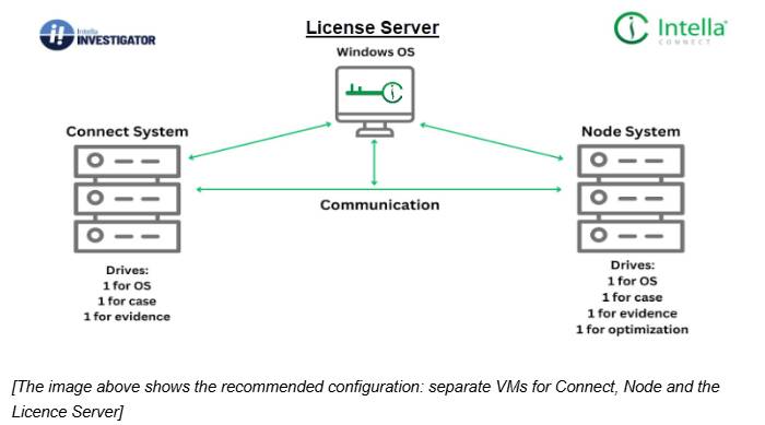 For Intella Connect specifically: to ensure performance and reliability, it is crucial to install Intella Connect and Intella Node on distinct systems. In addition, we strongly advise using a dedicated third virtual machine (VM) to host the software license, referred to as the "License Server." Having a separate, dedicated license VM is strongly recommended, since Intella licenses are hardware-locked. This setup enables future scaling of your Connect system without invalidating your license. This server must be continuously powered on to provide the license to your Connect and Node systems. A diagram of a standard system configuration is provided below.