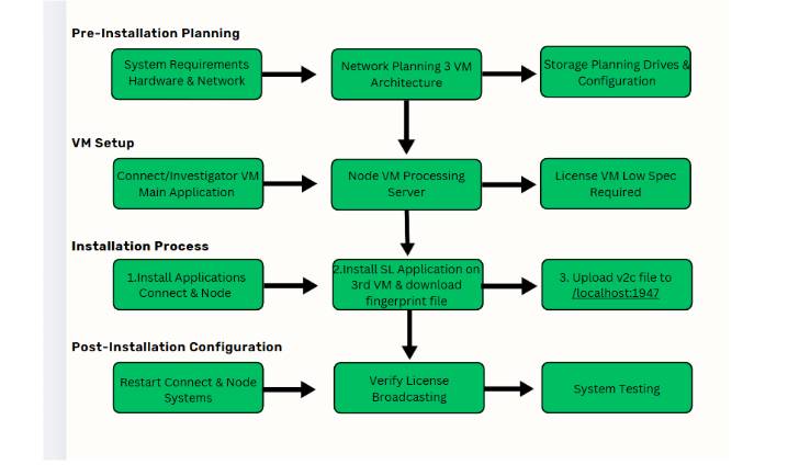 Consider the design to incorporate up to 3 servers: one for Connect/Investigator, one for Node, and one to hold your software license. As mentioned previously, we highly recommend using an independent VM to host the software license. Licenses are hardware locked (CPU, network card, motherboard, etc.) to specific machines. If you install the license directly on the Connect/Investigator machine and any changes are made to the machine, the license will become invalid. Hosting the license on a low spec VM will ensure that changes to the Connect/Investigator machine will have no effect on the license. The license that Vound supplies will be a network license and when configured it will broadcast the license to the Connect/Investigator and Node VMs from the license VM.