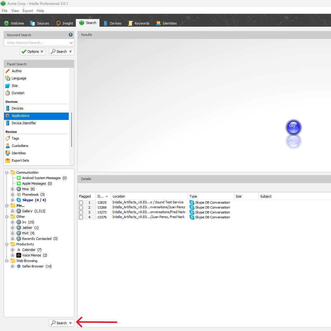You can quickly explore application-specific data by selecting an application or a specific media type within it, then clicking Search to return all related items in the results view. This makes it easy to isolate activity from a particular app or focus on a specific type of data within that app.